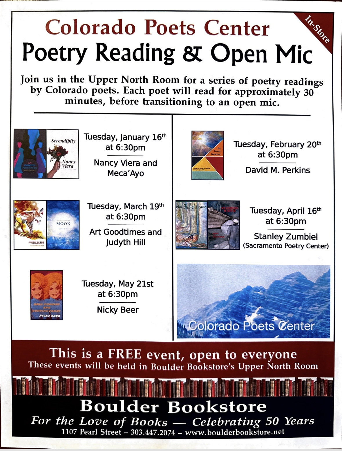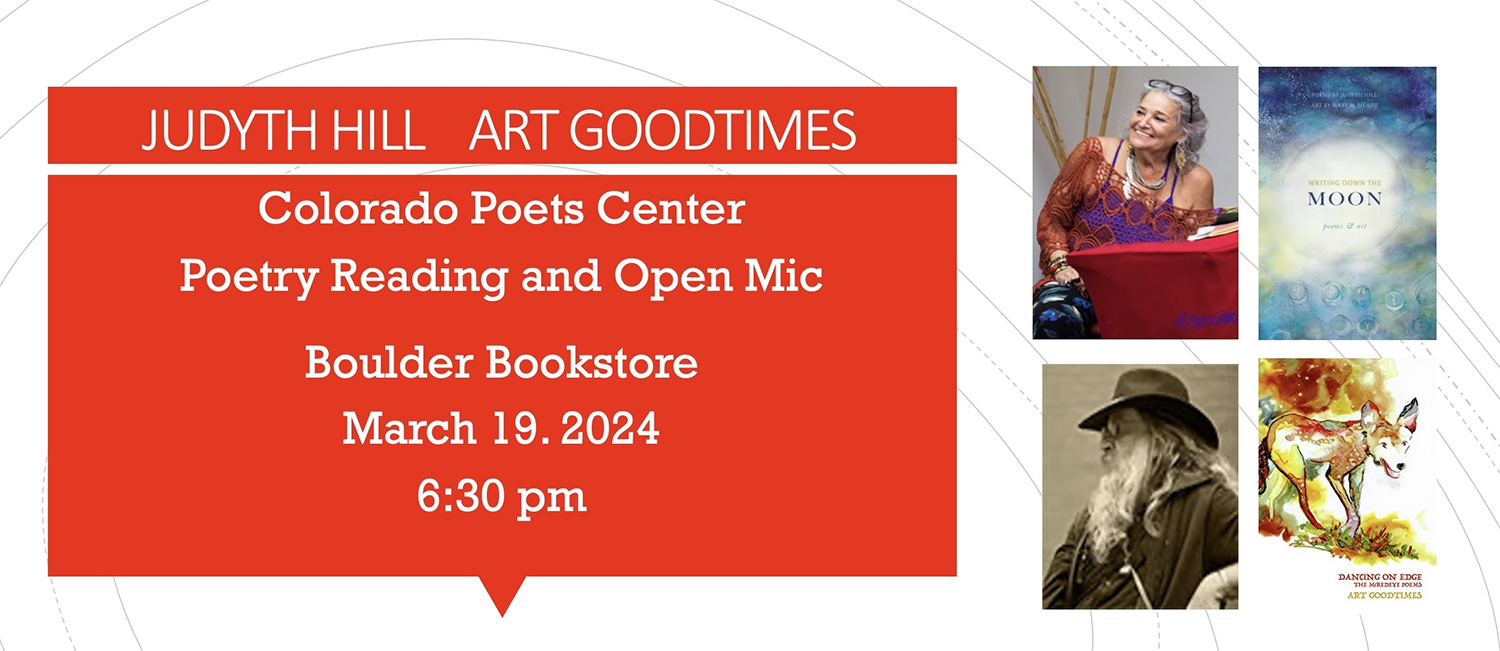 Judyth Hill and Art Goodtimes will be our next poets reading at the Boulder Bookstore on March 19 at 6:30 pm.